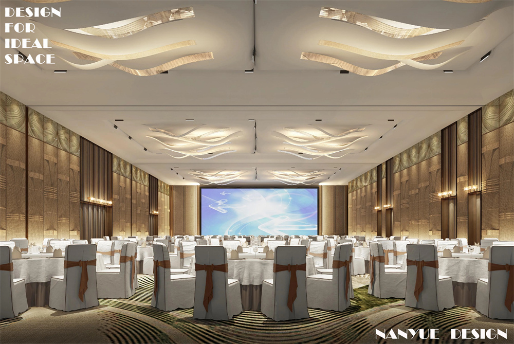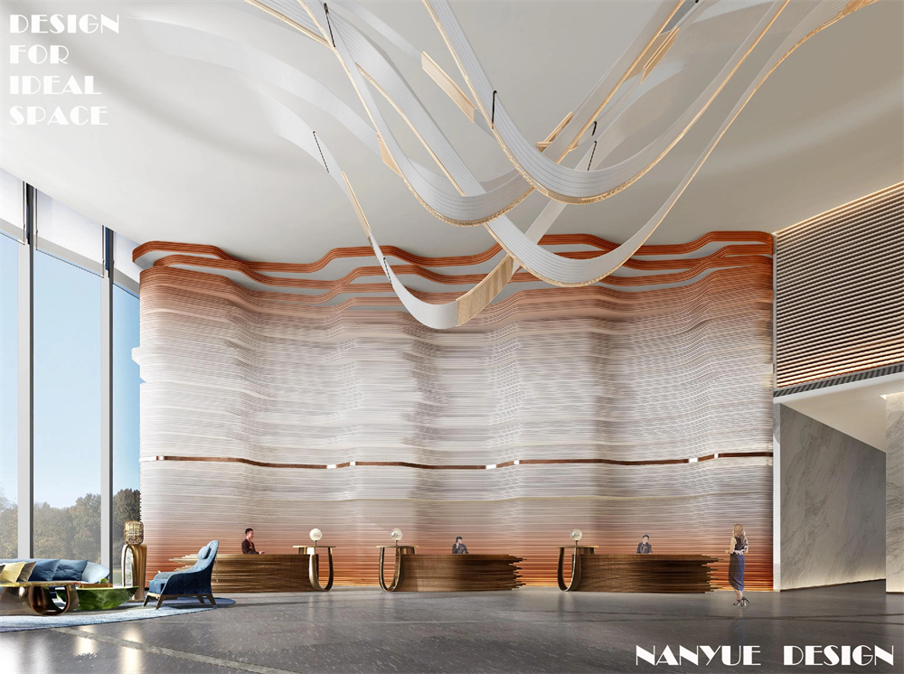 云南昭通高速鳳凰廣場酒店,設計靈感來源于鳳舞九天的靈動姿態,使用具有優美弧度的曲線設計元素,將自然靈動的線條貫穿室內空間,線條組合流動匯聚成面賦予空間生機,